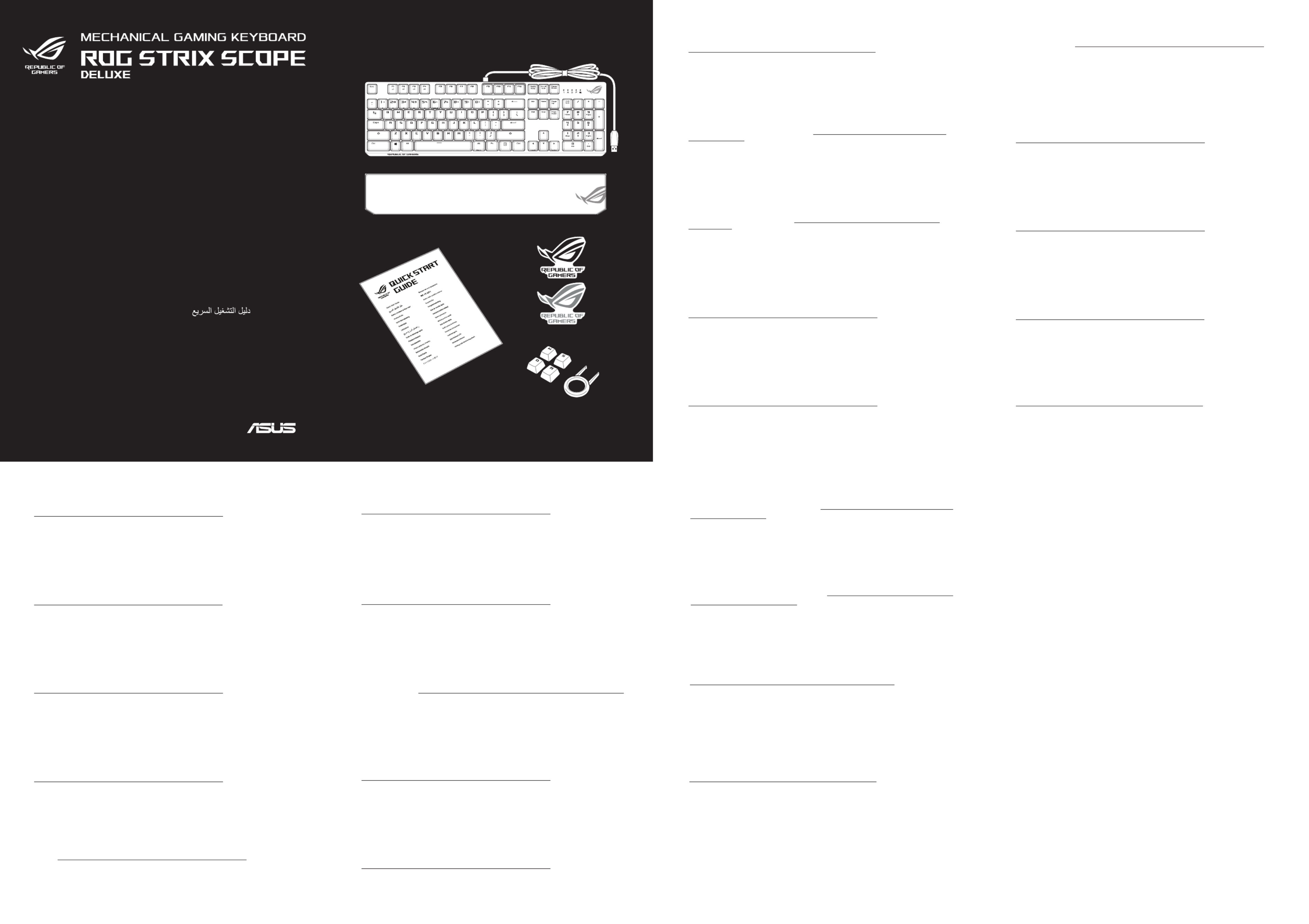 Her er Asus ROG Strix Scope Deluxe (Tastatur) brugervejledning. 2 sider på sprog Engelsk med en vægt på 0.4 Mb. Hvis du ikke kan finde svar på dit problem Spørg vores community.