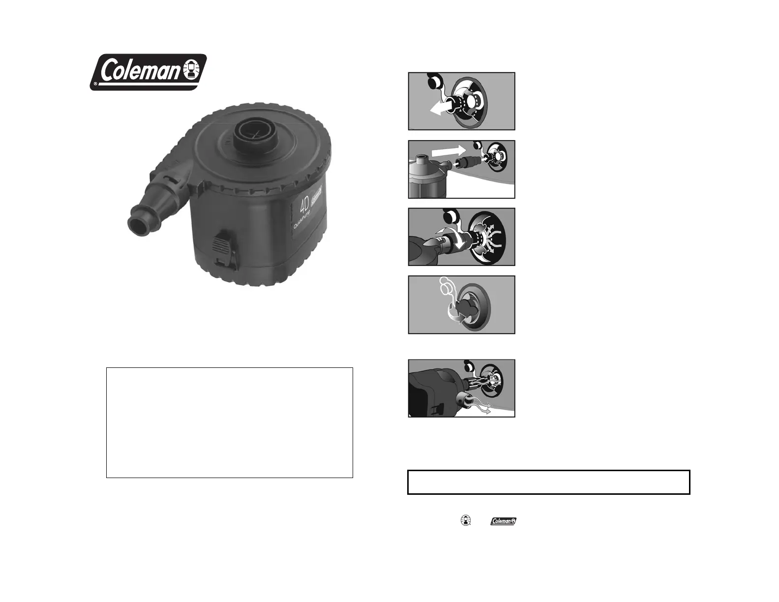 Her er Coleman 4D QuickPump (Pomp) brugervejledning. 2 sider på sprog med en vægt på 635,825.0 Mb. Hvis du ikke kan finde svar på dit problem Spørg vores community.