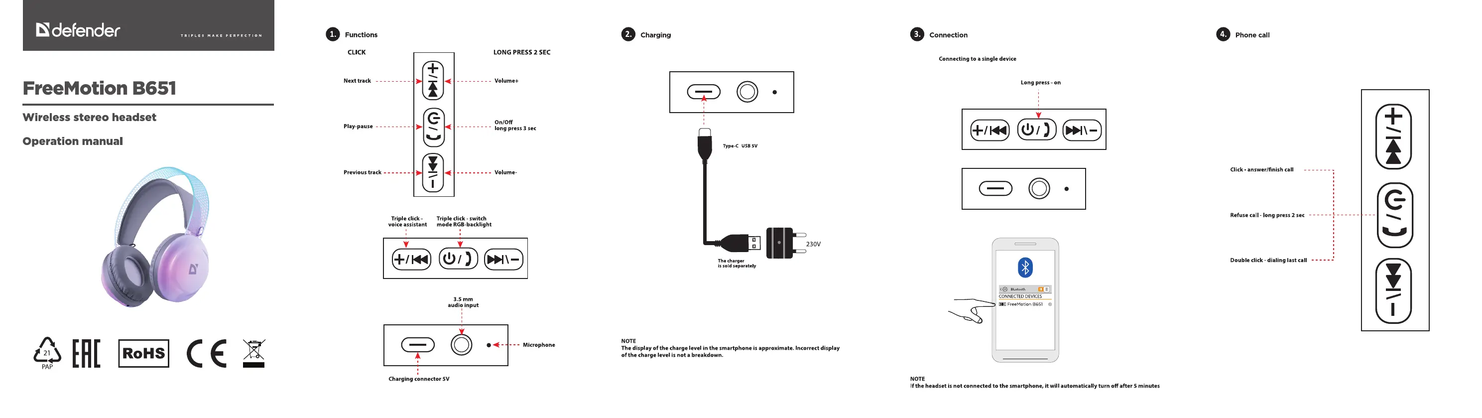 Her er Defender FreeMotion B651 (Headset) brugervejledning. 8 sider på sprog med en vægt på 3,140,383.0 Mb. Hvis du ikke kan finde svar på dit problem Spørg vores community.
