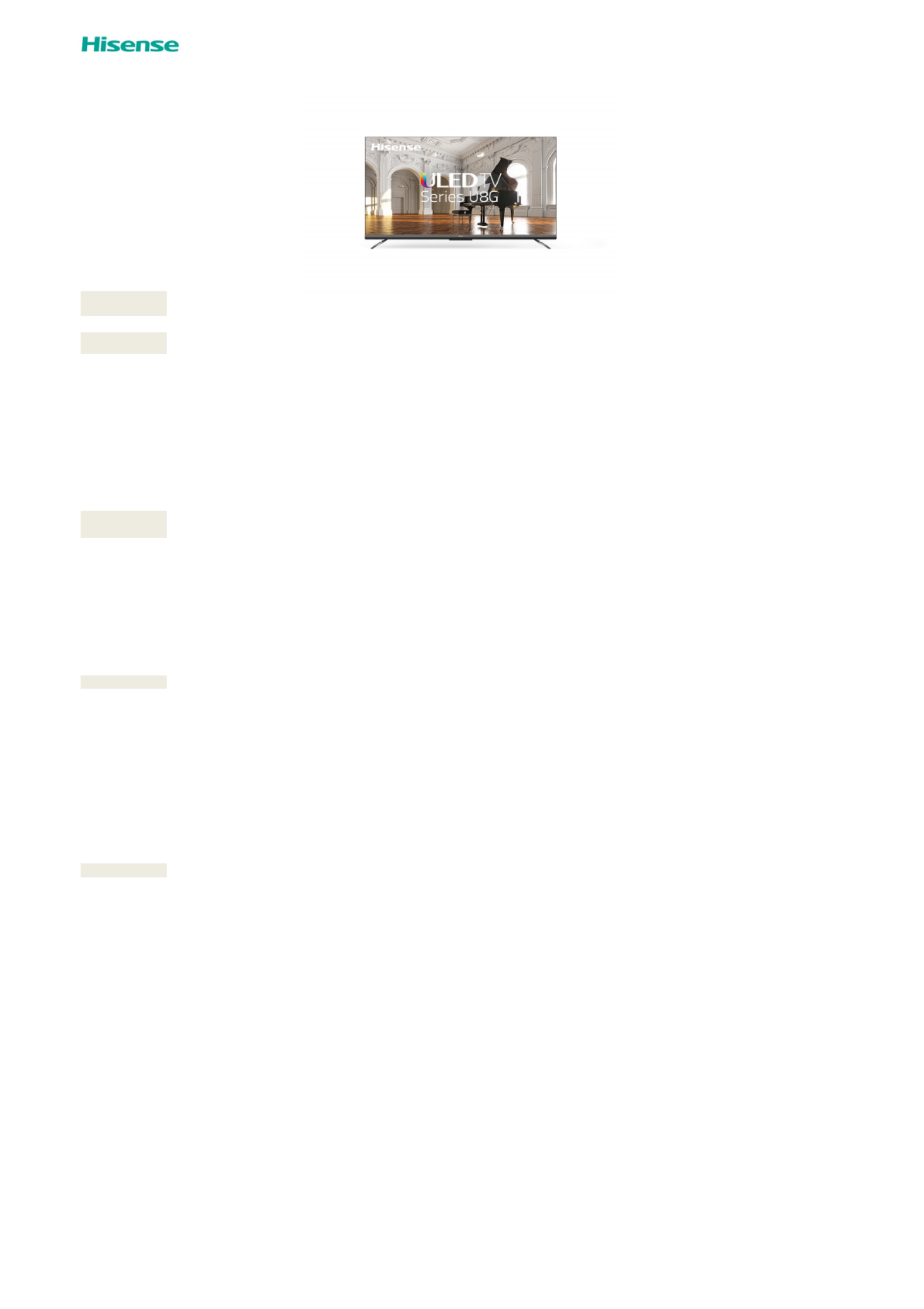 Her er Hisense U8G 85U8G (TV) brugervejledning. 2 sider på sprog Engelsk med en vægt på 0.2 Mb. Hvis du ikke kan finde svar på dit problem Spørg vores community.