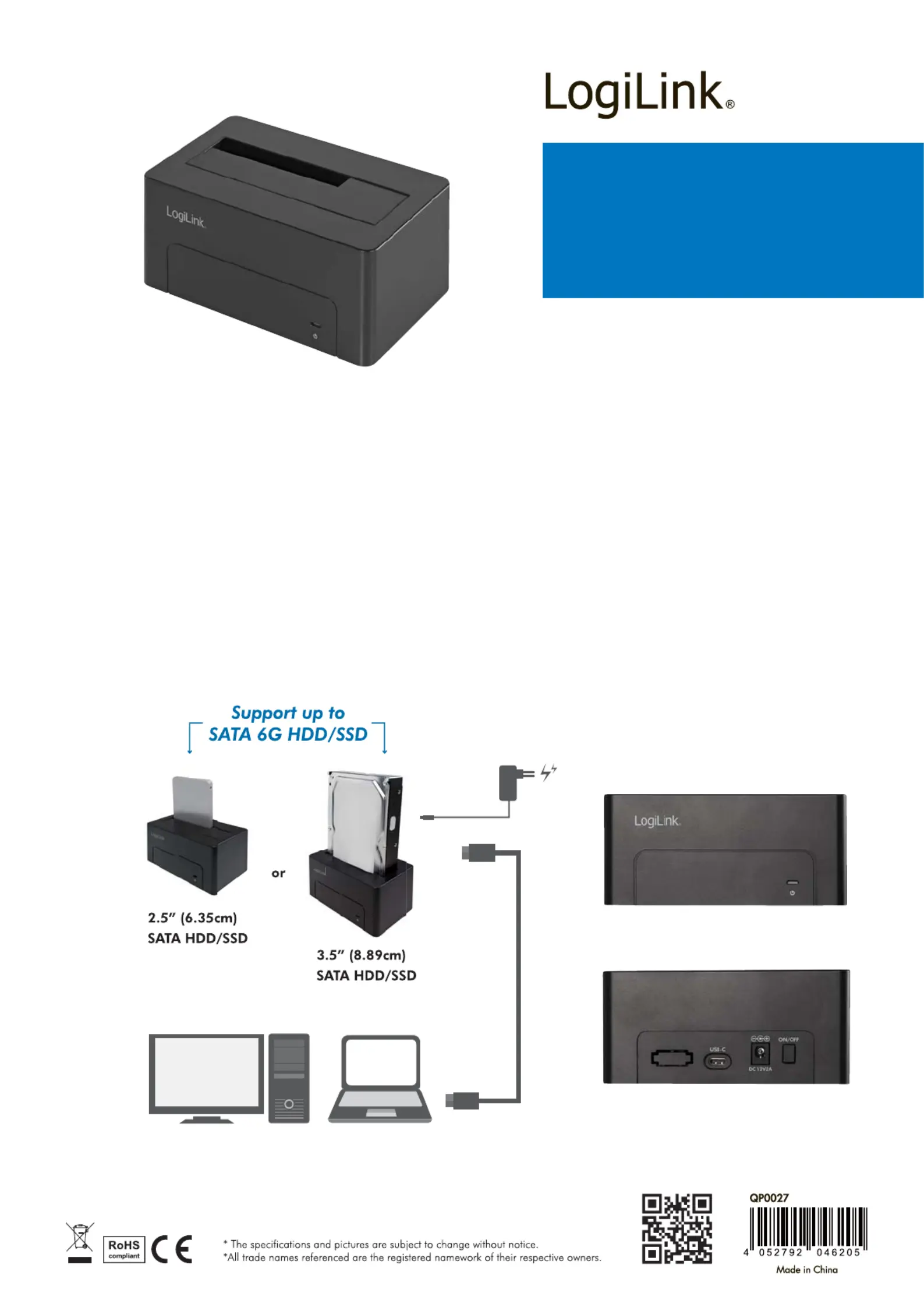 » Connects to 2.5“(6.35cm)/3.5”(8.89cm) SATA 1.5G/3G/6G HDD/SSD up to 15mm
