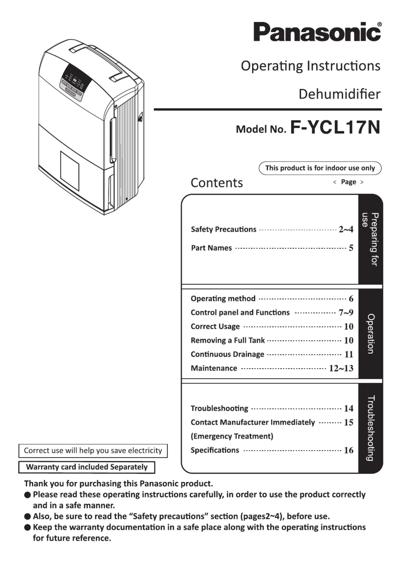 Her er Panasonic F-YCT17V (Affugter) brugervejledning. 16 sider på sprog med en vægt på 2,273,150.0 Mb. Hvis du ikke kan finde svar på dit problem Spørg vores community.