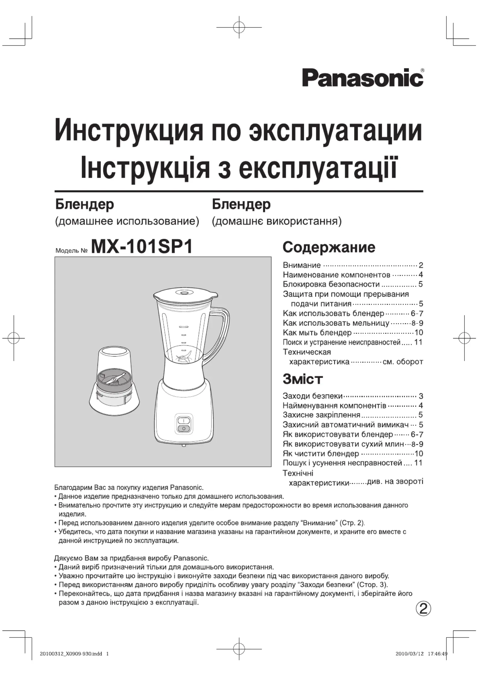 Her er Panasonic MX-101SP1 (Blender) brugervejledning. 12 sider på sprog med en vægt på 1,853,235.0 Mb. Hvis du ikke kan finde svar på dit problem Spørg vores community.