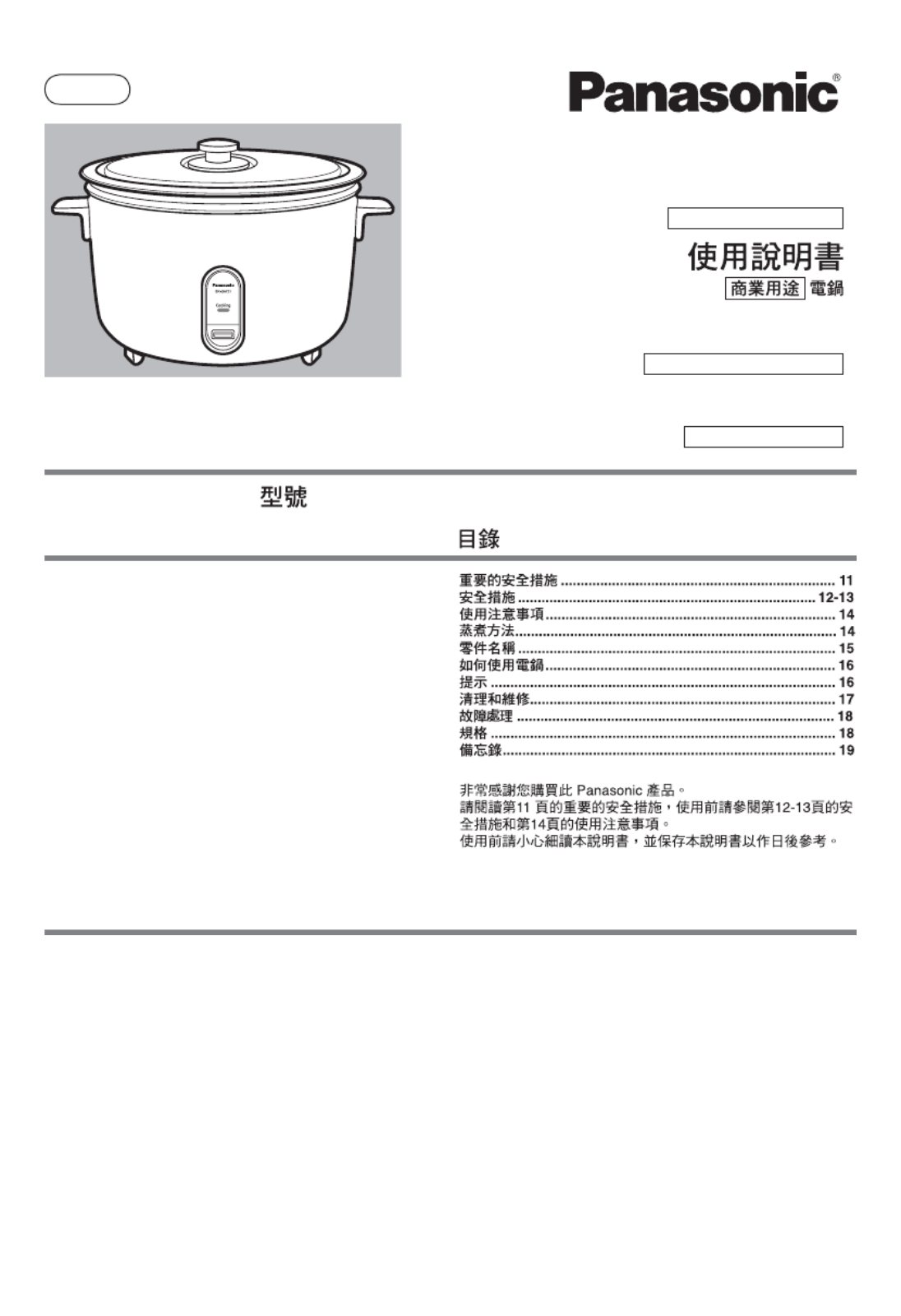 Thank you very much for purchasing Panasonic Product.