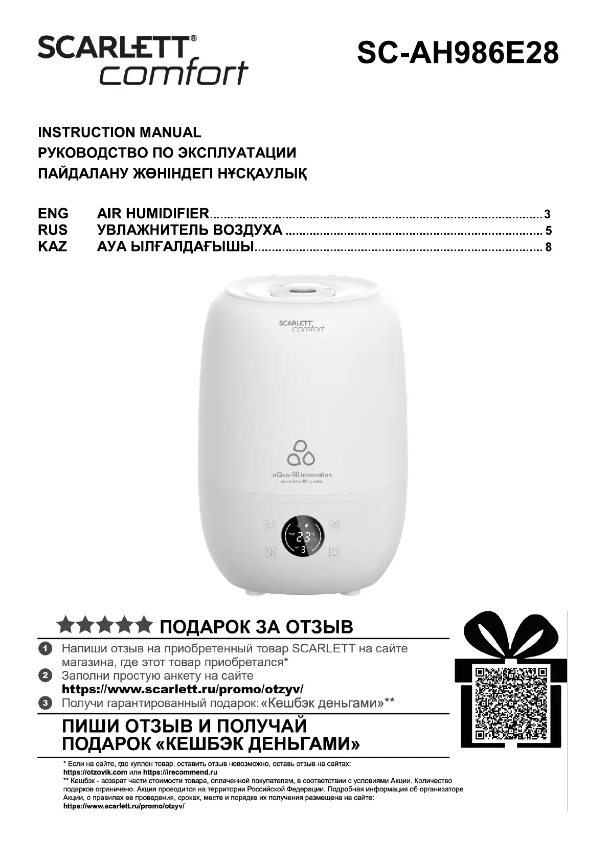 Her er Scarlett SC-AH986E28 (Luftfugter) brugervejledning. 12 sider på sprog med en vægt på 2,455,494.0 Mb. Hvis du ikke kan finde svar på dit problem Spørg vores community.