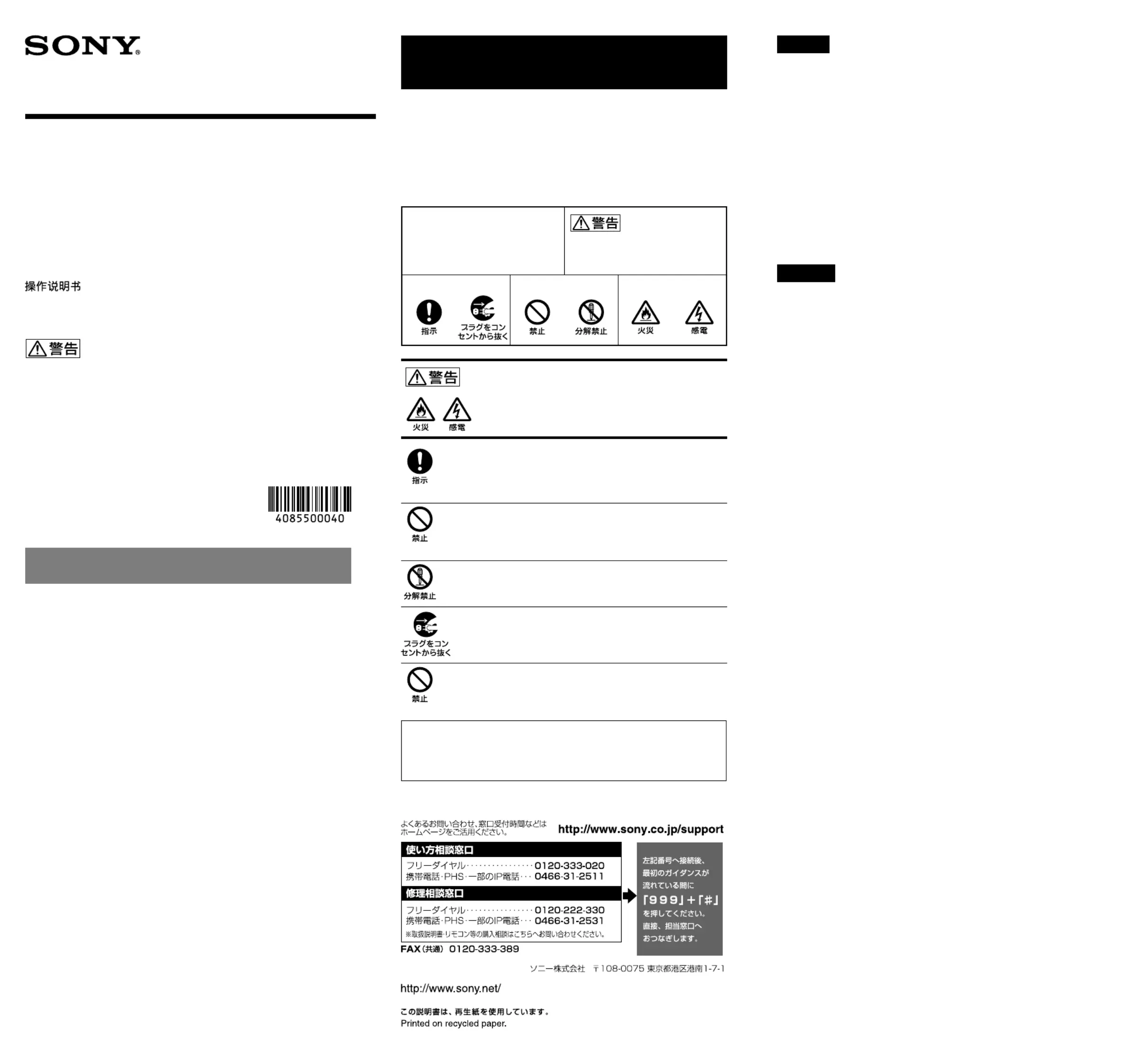 ソニー製品は安全に充分に配慮して設計されています。しかし、まちがっ