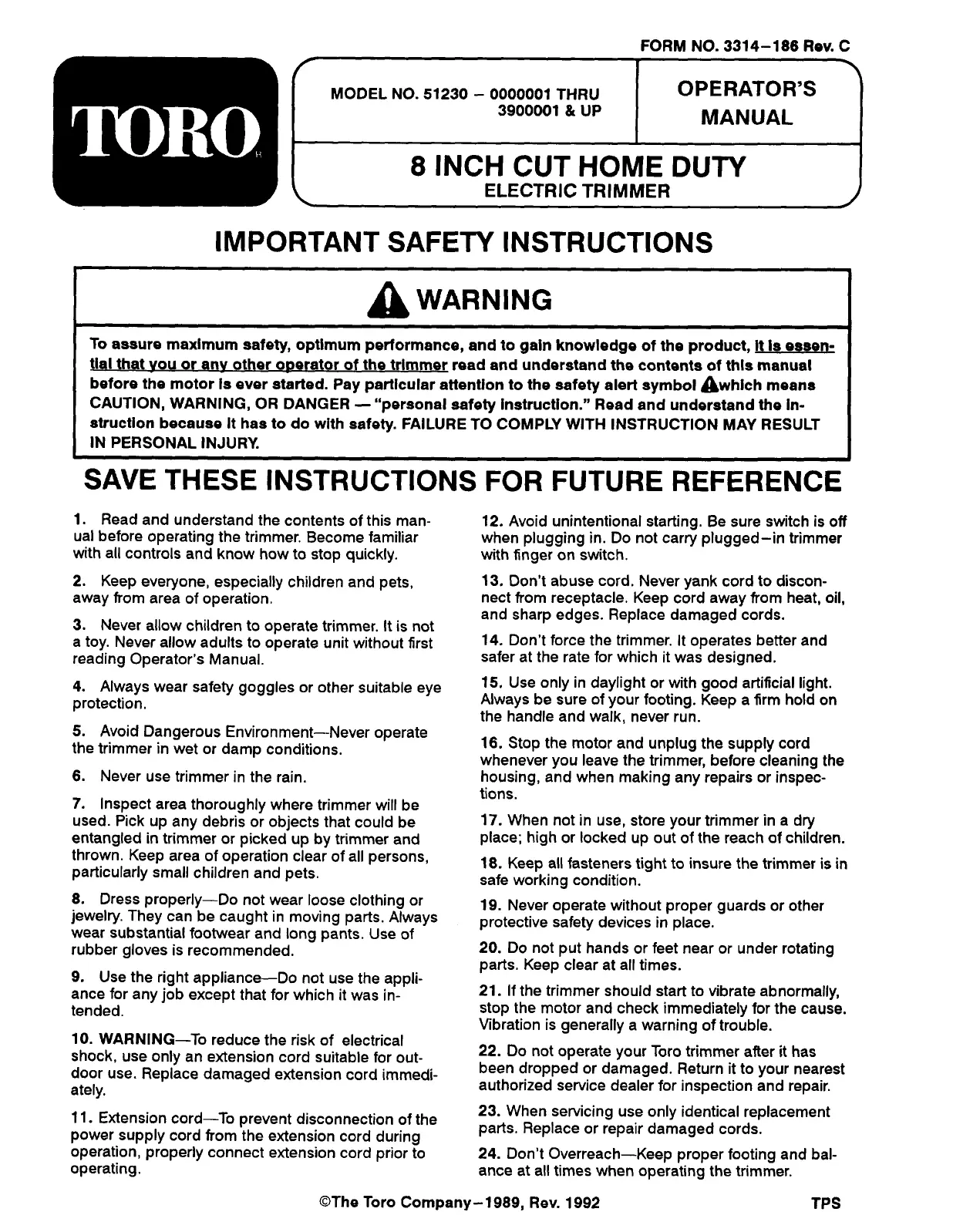 Her er Toro 51230 (Græstrimmer) brugervejledning. 8 sider på sprog med en vægt på 1,339,033.0 Mb. Hvis du ikke kan finde svar på dit problem Spørg vores community.