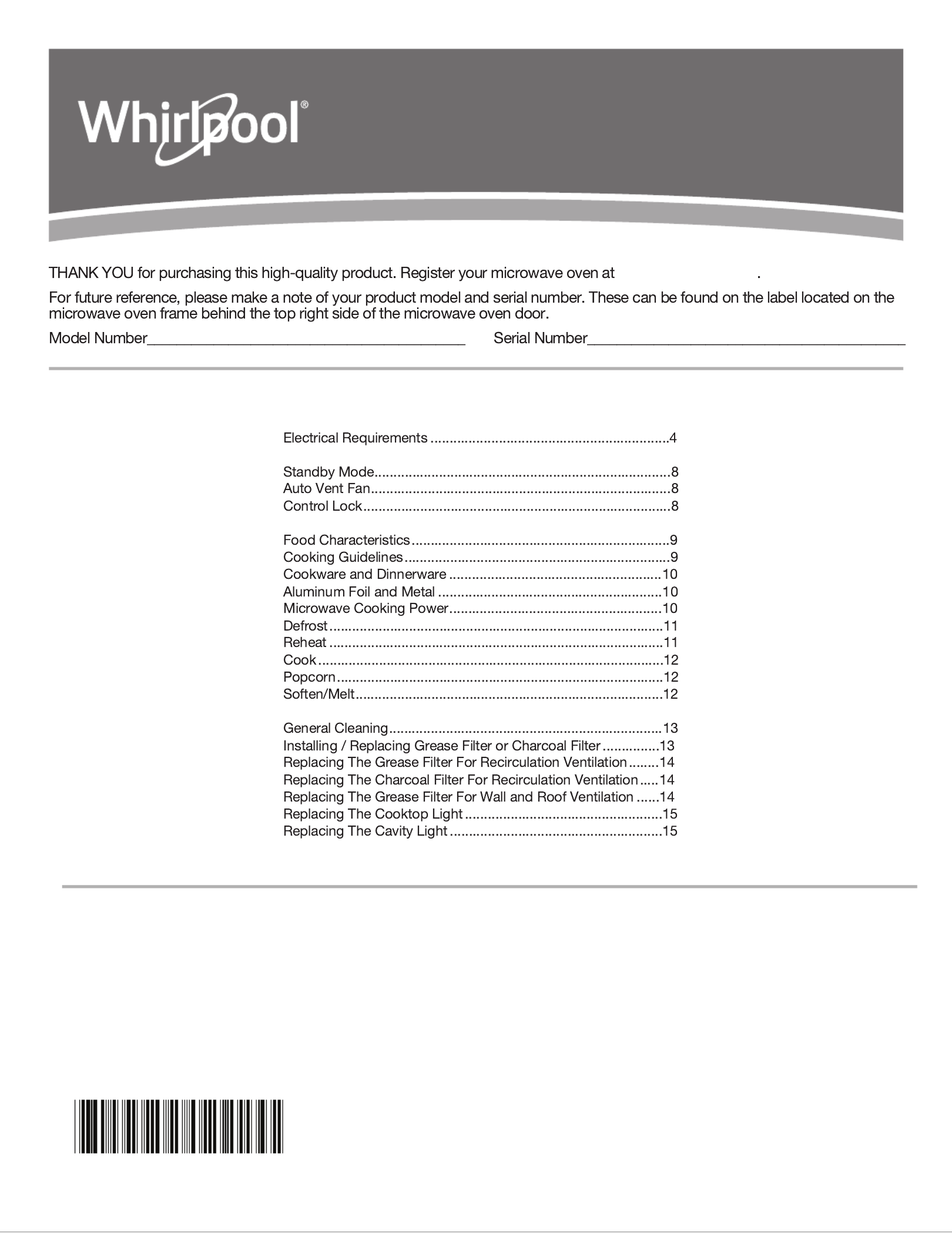 MICROWAVE OVEN CARE ..........................................................13